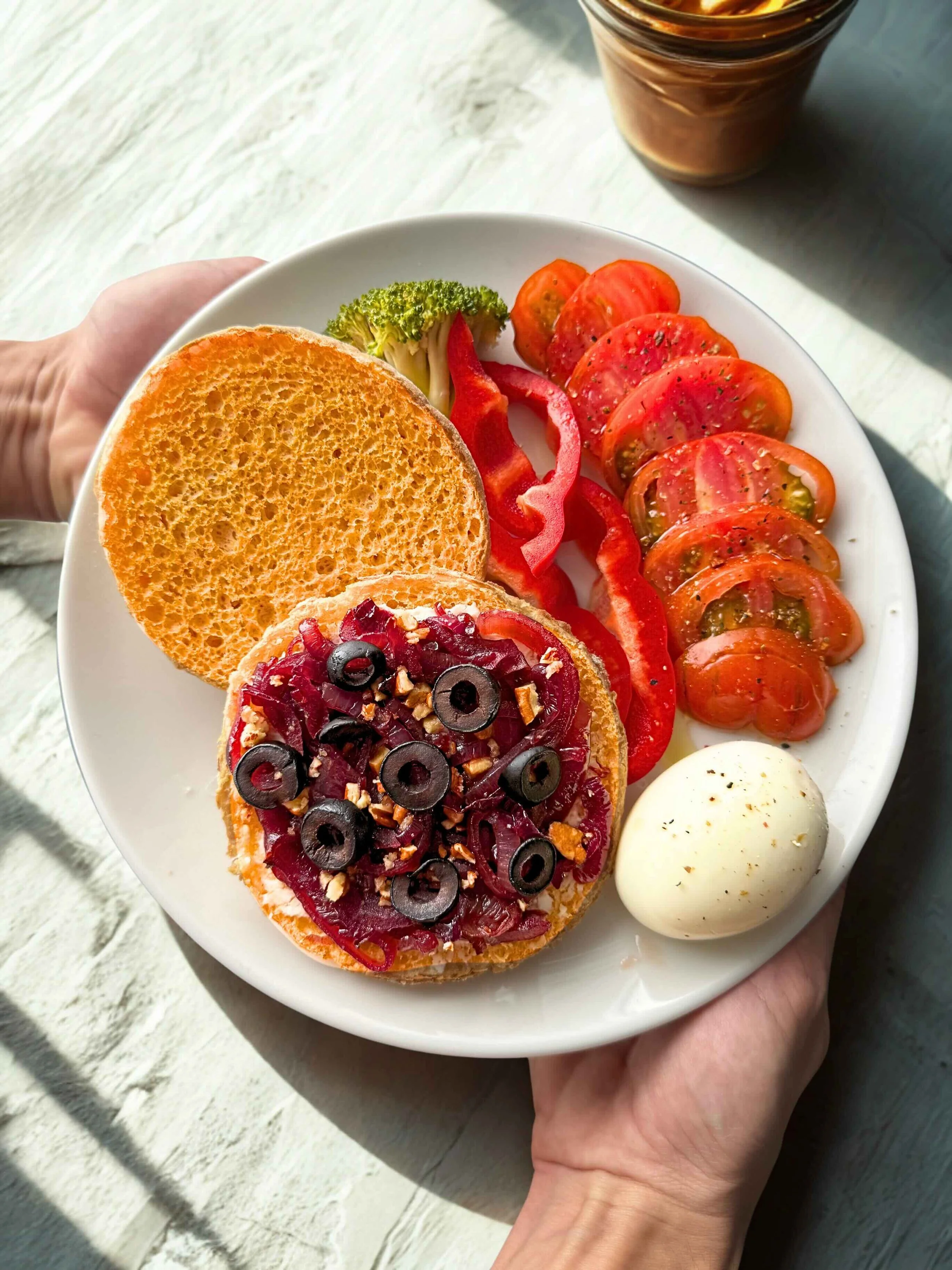 This hummus toast with boiled egg and black olives is a quick, protein-rich breakfast or snack. Served on whole grain bread with creamy hummus, sliced egg, and salty olives.
